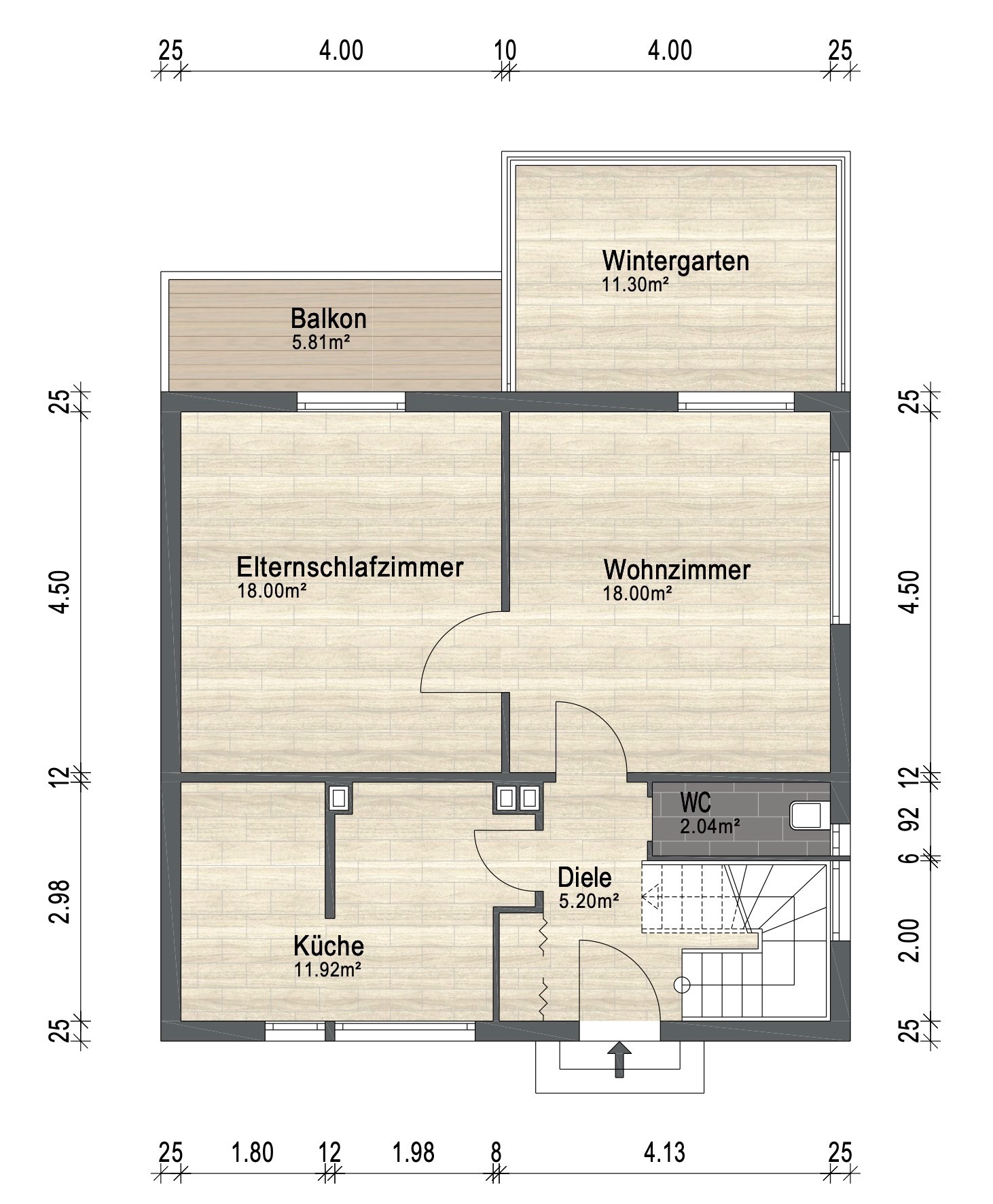 Im Erdgeschoss befinden sich die Küche mit Essbereich, das Große Wohnzimmer mit angrenzendem Wintergarten, ein großes Schlafzimmer mit Balkon, sowie das Gäste-WC.